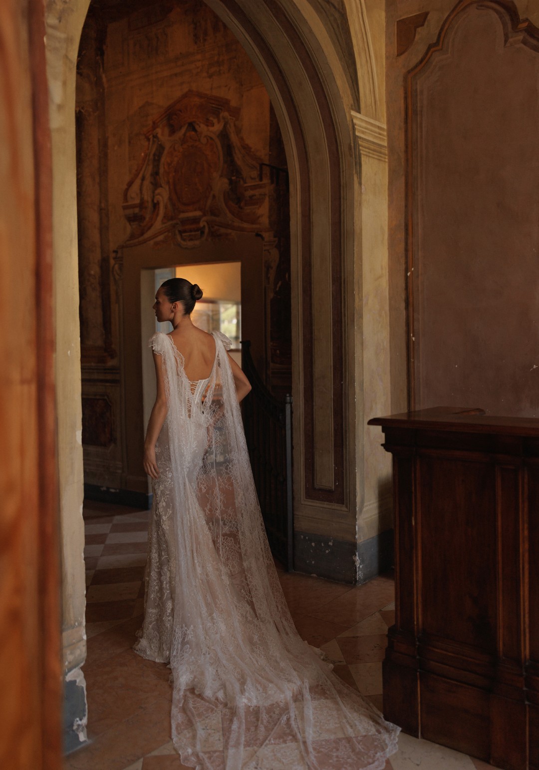A lightweight matching shawl, also embroidered with delicate floral motifs, completes the look with an airy, sophisticated finish. Perfect for brides seeking a couture feel that is both sensual and effortlessly refined.