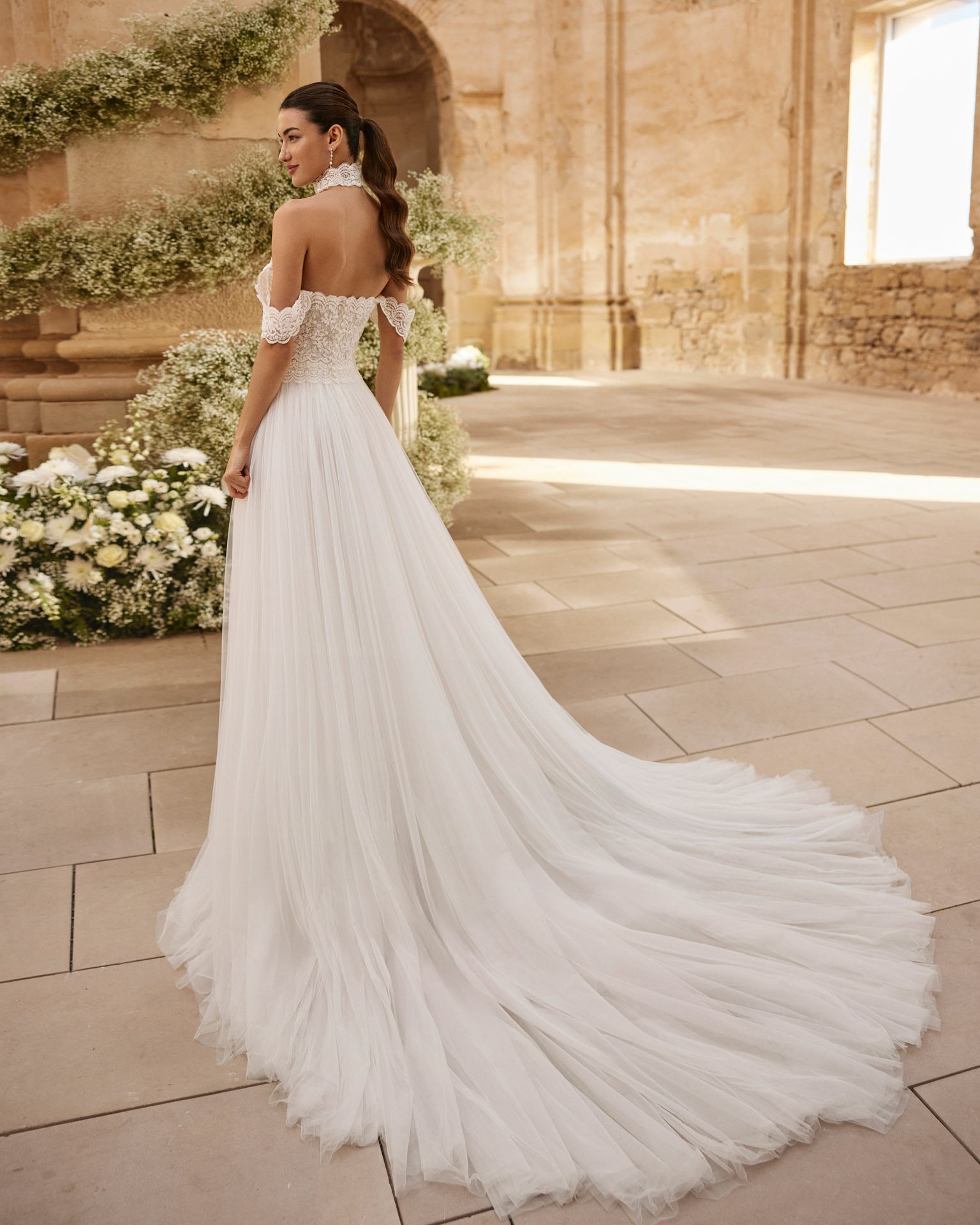 Robe de mariée coupe-A. En tulle soyeux. Décolleté cœur, bretelles tombantes, dos nu et jupe fendue sur le côté avec collier.