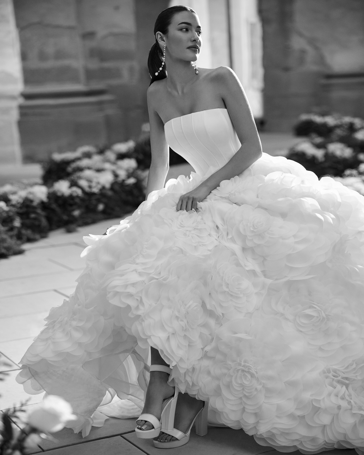 Robe de mariée princesse spectaculaire, au volume généreux. Le corsage bustier structuré met en valeur la silhouette avec élégance, tandis que le dos effet corset souligne la taille. La jupe se déploie en une cascade de fleurs 3D raffinées, créant un rendu romantique et majestueux. Un modèle d’exception pour une mariée qui souhaite allier modernité et féérie.