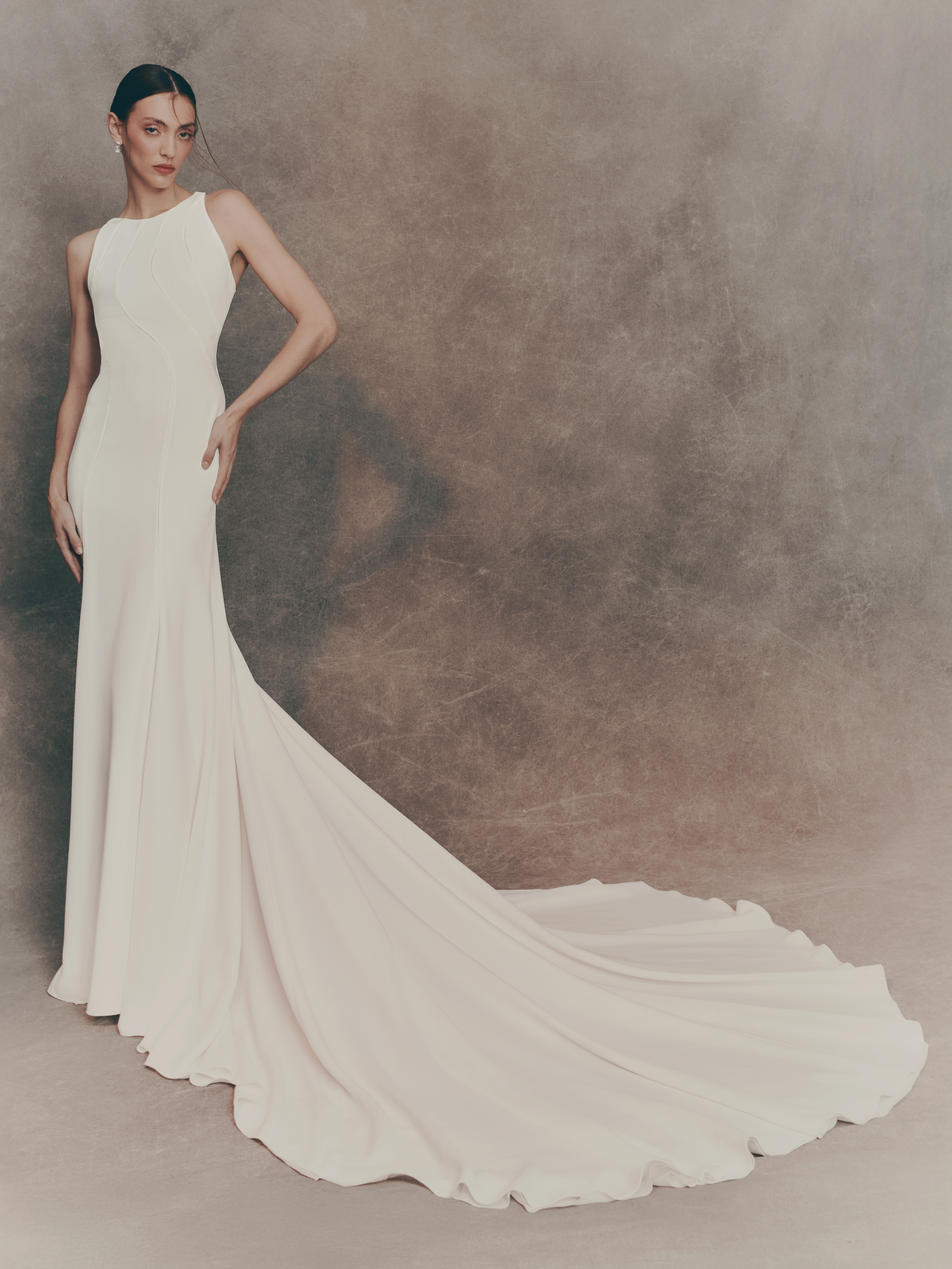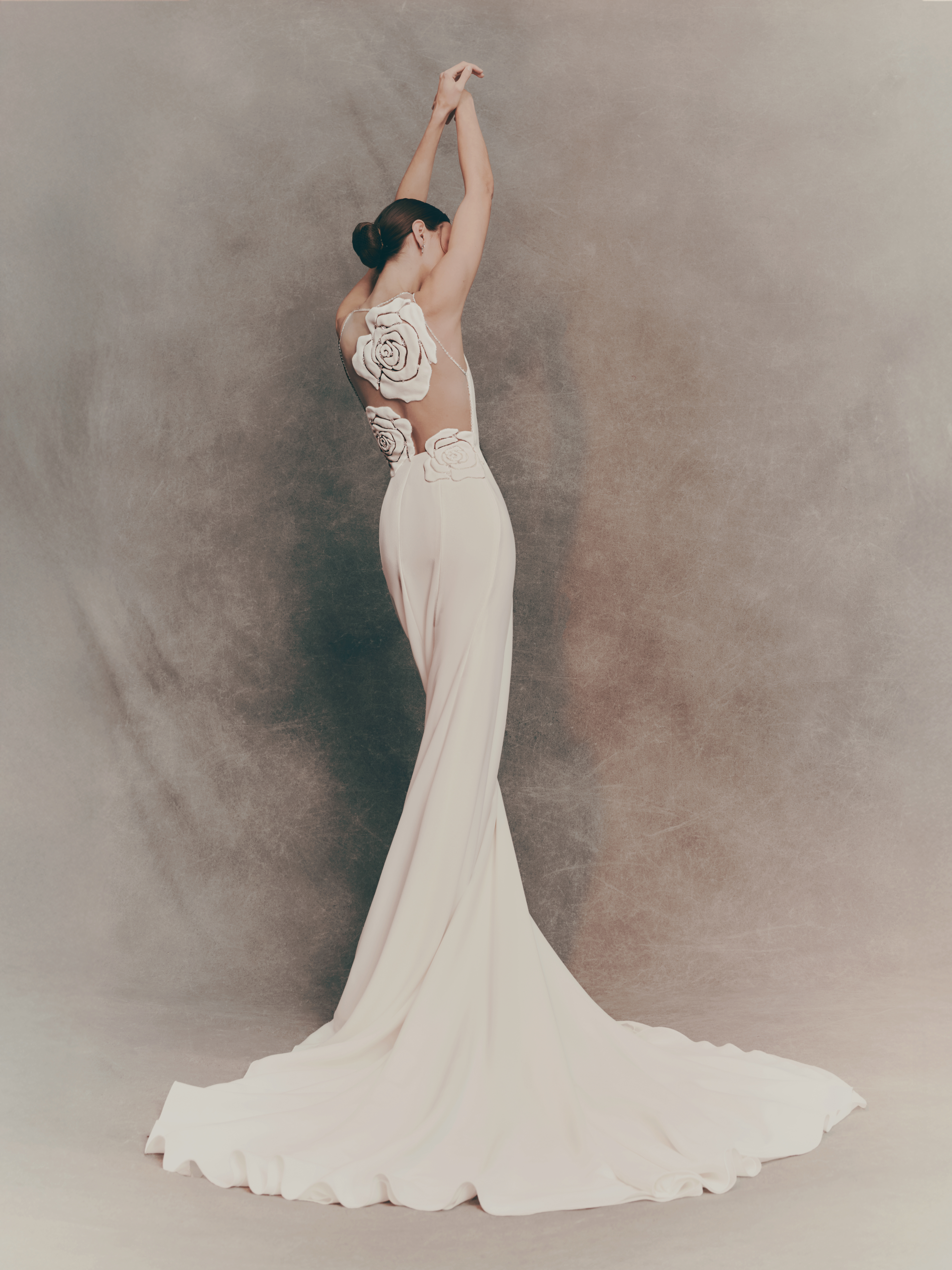 Élégante et audacieuse, cette robe de mariée en crêpe lisse épouse la silhouette avec fluidité et raffinement. Son col américain met en valeur les épaules, tandis que le dos nu orné de transparences délicates révèle de subtils motifs floraux brodés. La coupe ajustée allonge la ligne du corps et se prolonge par une traîne spectaculaire, alliant minimalisme moderne et sensualité assumée. Une création sophistiquée pour la mariée qui souhaite une allure à la fois contemporaine et pleine de caractère.