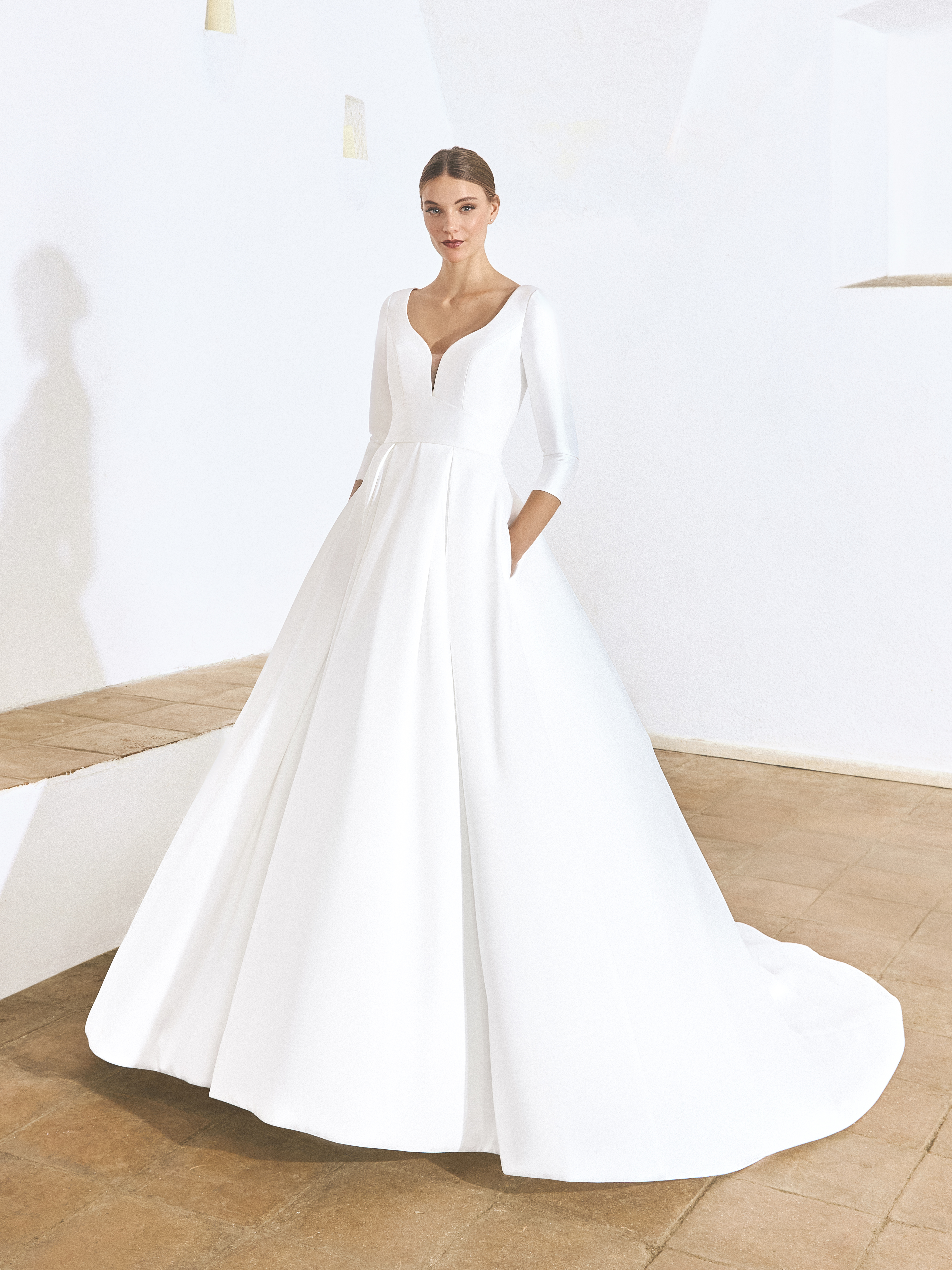 Robe de mariée princesse, mikado, décolleté V, manches 3/4.
