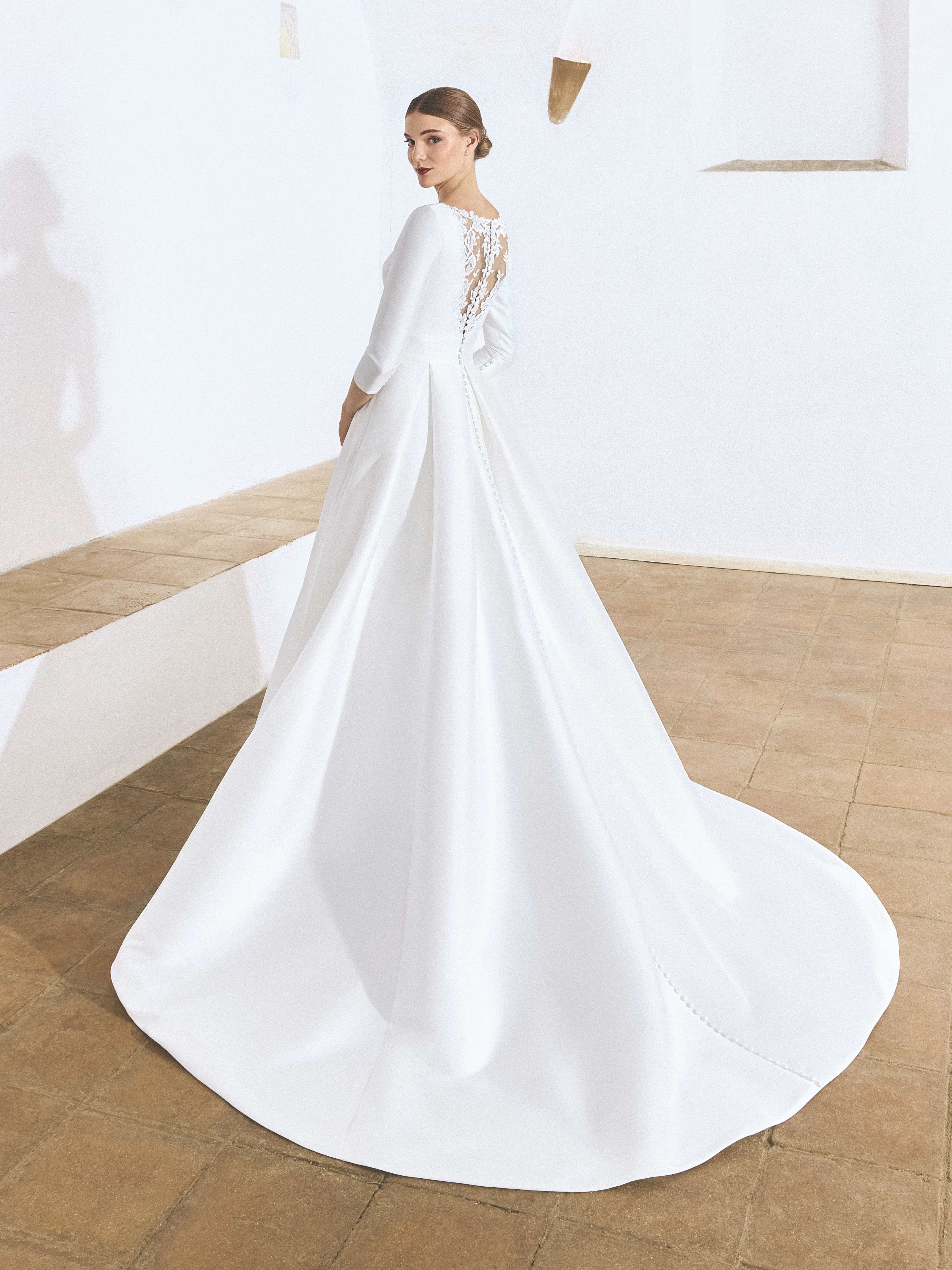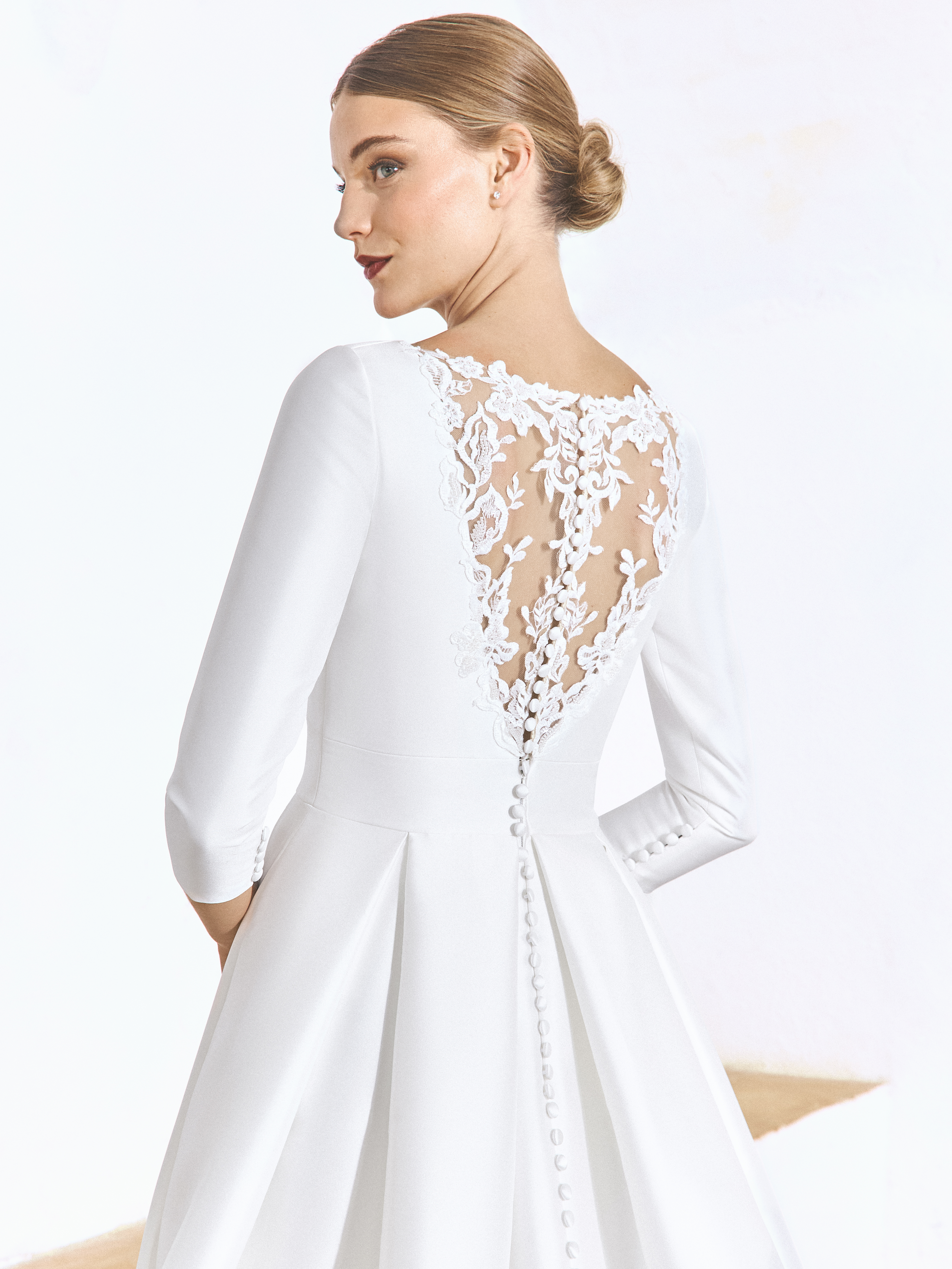 Confectionnée dans un mikado raffiné, cette robe de mariée dessine une coupe princesse moderne. Le corsage à encolure en V et les manches ¾ apportent équilibre et sophistication, pour une allure royale et contemporaine.