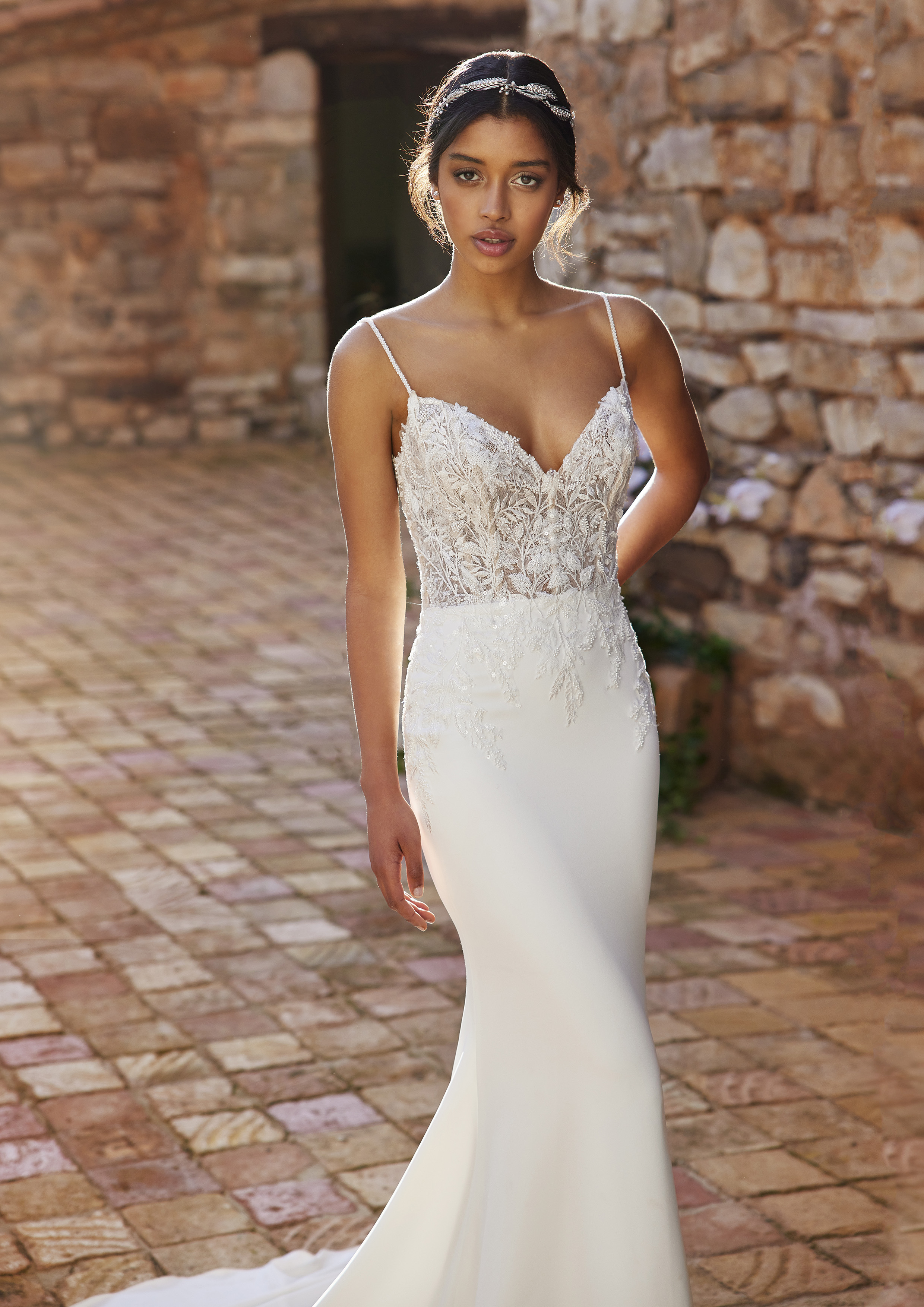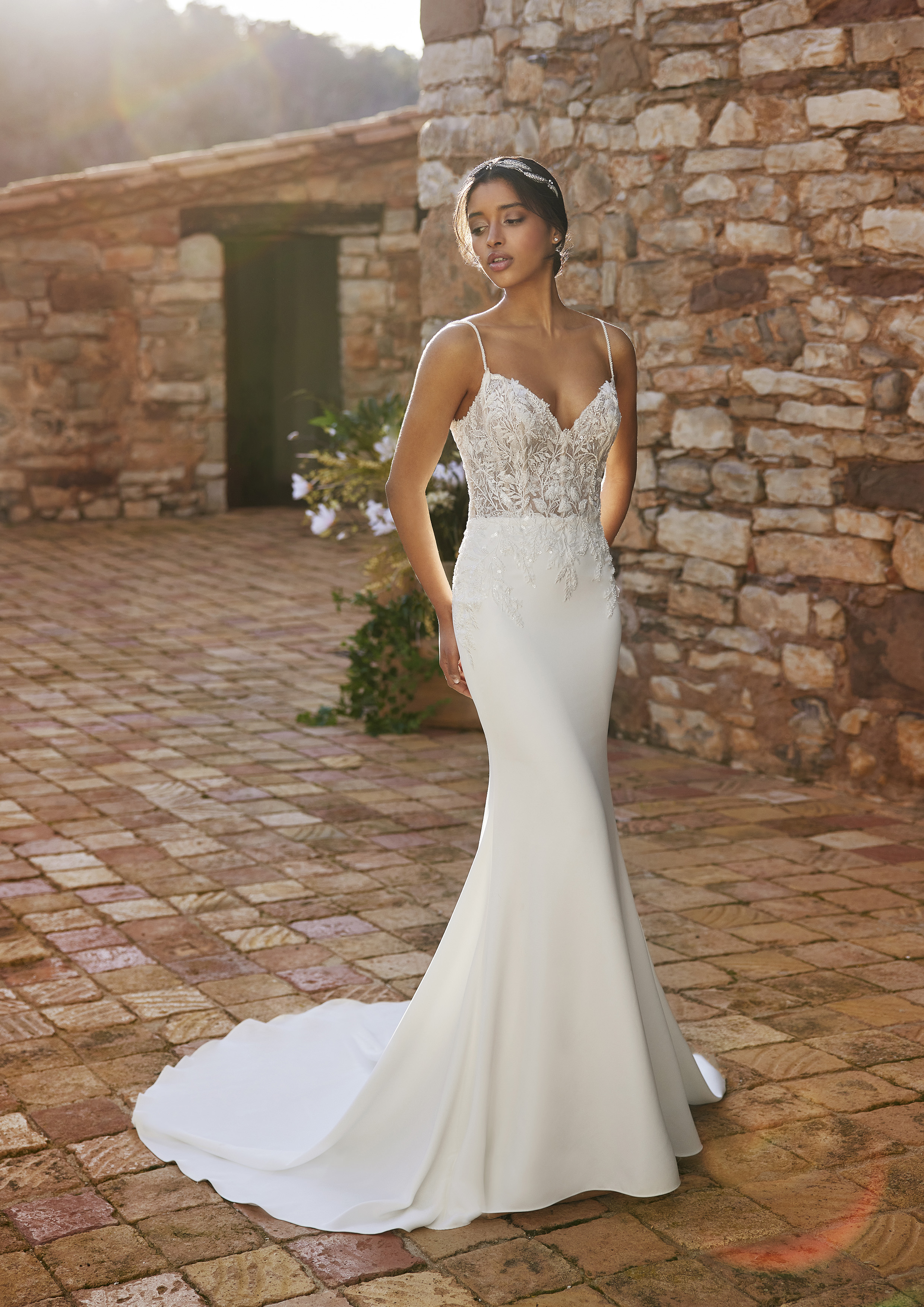 Robe de mariée sirène alliant sensualité et élégance. Son corsage en dentelle de Chantilly façon lingerie sublime la silhouette, tandis que la jupe en crêpe fluide épouse délicatement les formes. Pour la cérémonie, une surjupe en tulle aérienne ajoute volume et majesté, avant de révéler une coupe sirène raffinée pour la fête.
